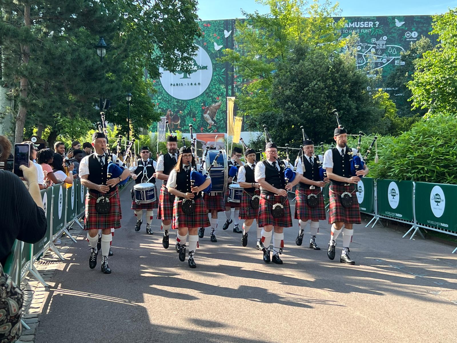 Après le relai de la flamme vient celui de la musique : tout au long de la matinée, le pipe band a déambulé dans le Jardin d’Acclimatation en relai avec un couple de sonneurs du Bagad de Lann-Bihoué.